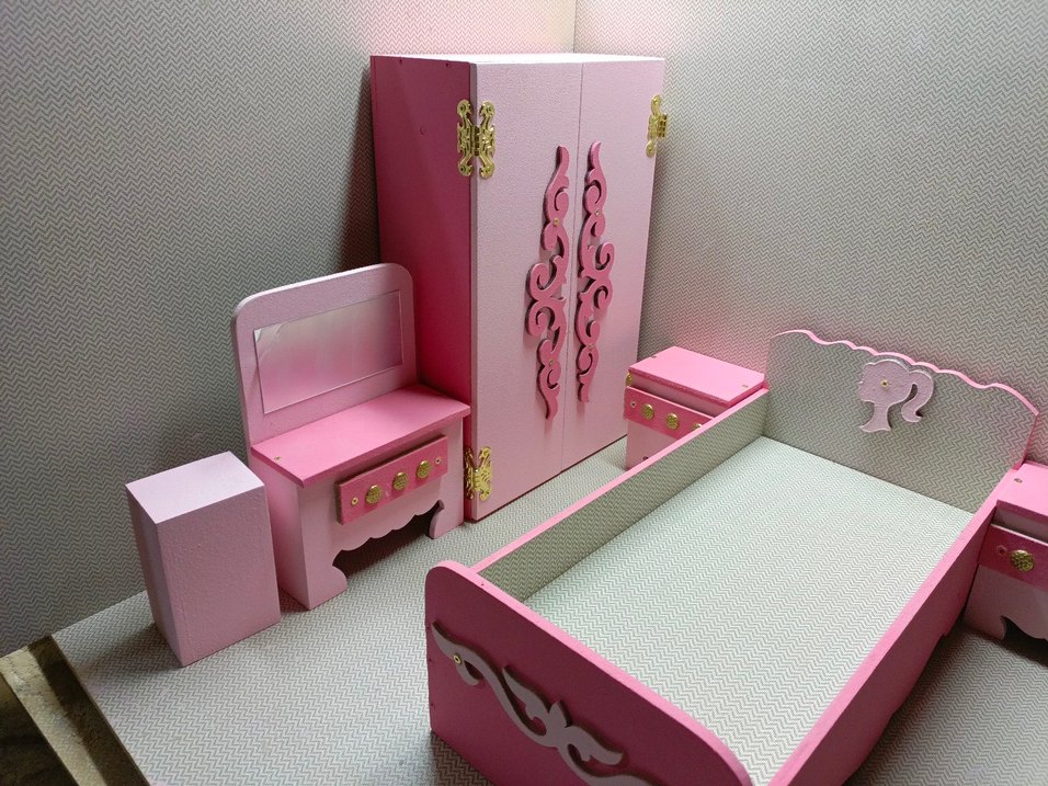 Pastel pembe renkli çocuk oyun mobilyası seti; yatak, dolap, aynalı makyaj masası ve küçük komodinden oluşur, dekoratif detaylara sahiptir. ️barbie bebekler görseldir ürüne dahil değildir