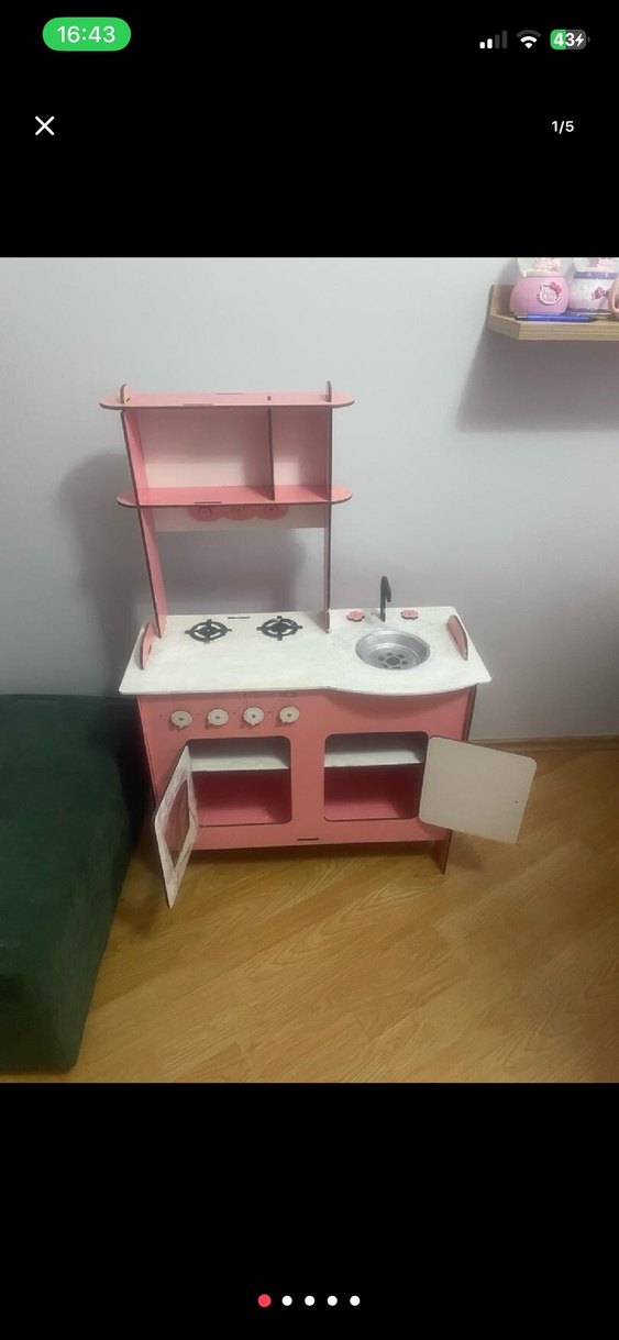 Pastel pembe çocuk oyun mutfağı, düğmeli ocak, lavabo ve kapaklı dolaplarıyla hayal gücünü destekler. 105cm*70cm*30cm
