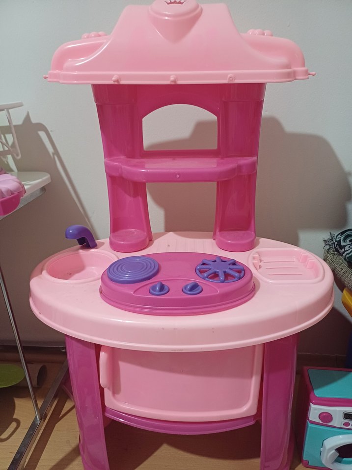 Pastel pembe renkte, ocak, lavabo ve raflar içeren çocuk oyun mutfak seti. Dayanıklı plastikten üretilmiş, yuvarlatılmış kenarlara sahip. Sıkıntısı Yoktur.