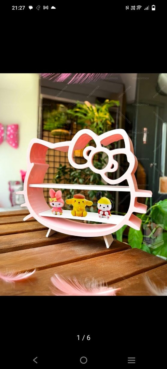Pastel pembe renkte, sevimli karakter şeklinde çocuk rafı. Küçük oyuncaklar veya dekorlar için uygun, odalara neşeli bir dokunuş katar.