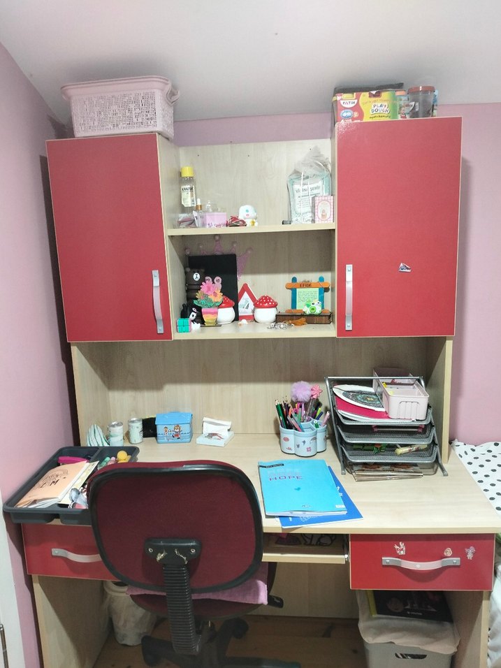 Pastel pembe çocuk rafı, dolaplar ve açık raflarla okul malzemeleri ve oyuncaklar için düzen sağlar.