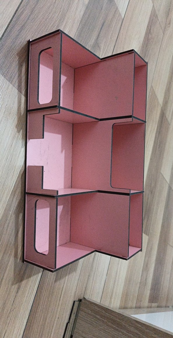 Pastel pembe renkte, çocuk eşyalarını düzenlemek için çok bölmeli raf. Yumuşak pastel tonu odalara hoş bir hava katıyor.