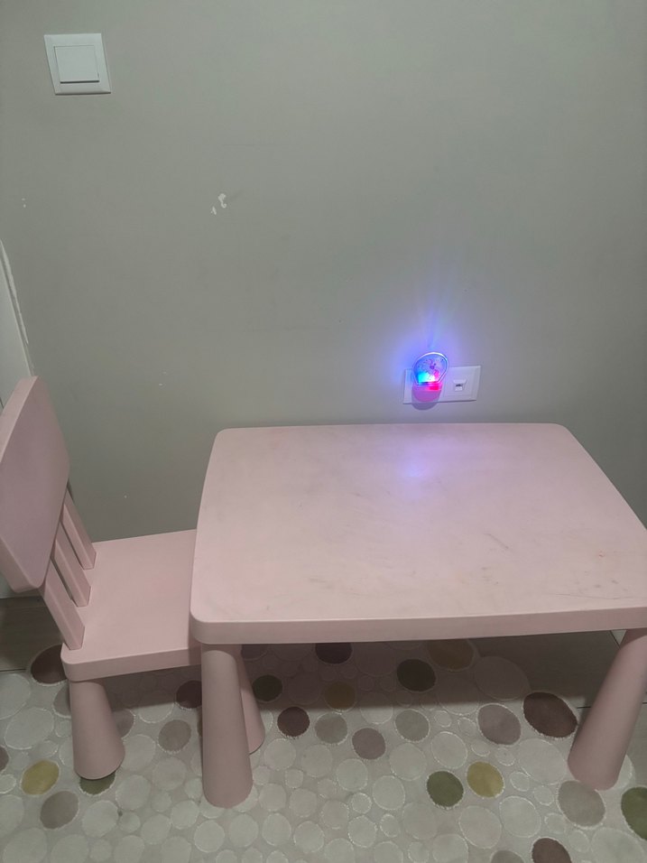 Pastel pembe renkte, geniş ayaklı ve sırt dayamalı sağlam çocuk sandalyesi. Mammut