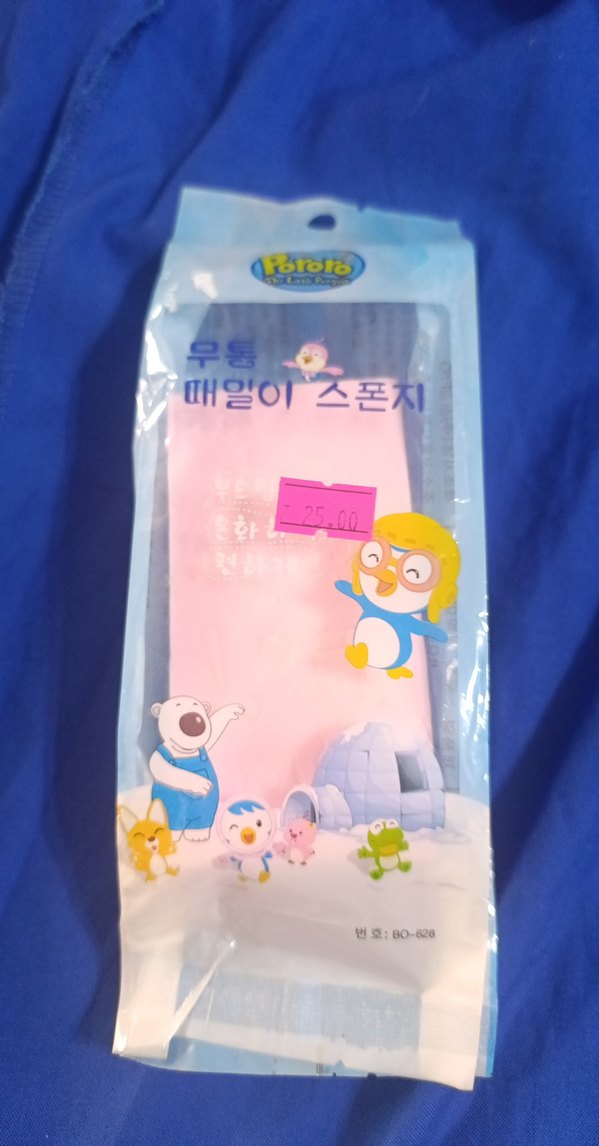 Pororo karakterli pastel pembe çocuk süngeri, yumuşak ve günlük kullanım için uygundur.