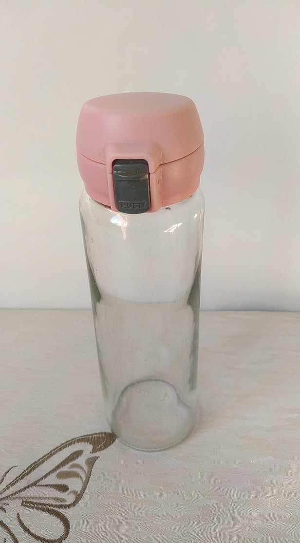 Pastel pembe renkte, çocuklar için push butonlu kapaklı ve şeffaf gövdeli termos şişe.