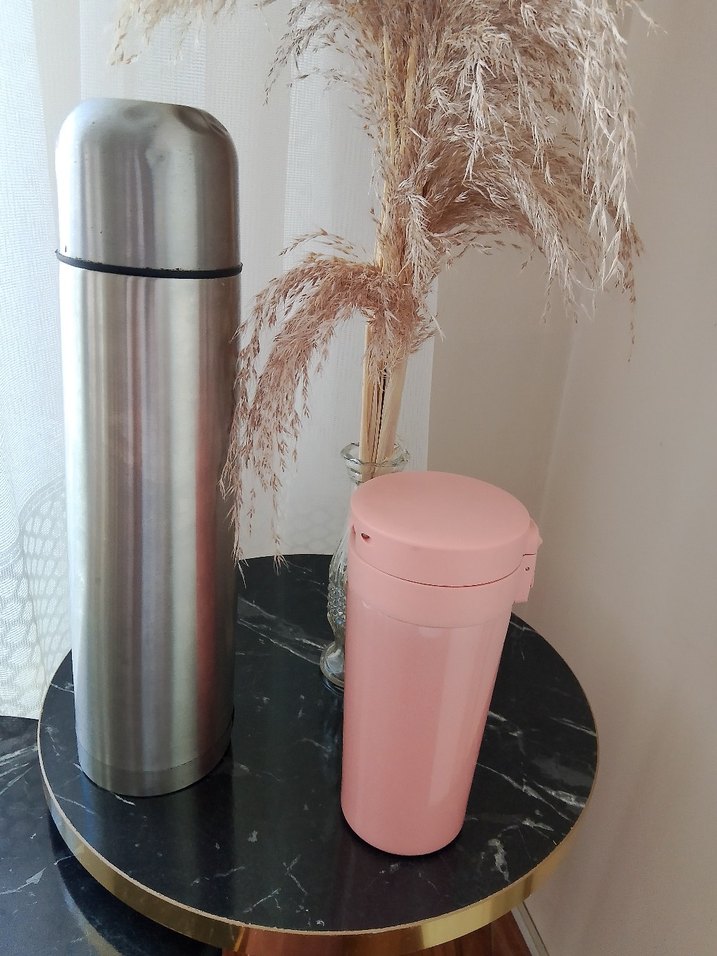 Pastel pembe renkli çocuk termos şişesi, içecekleri sıcak veya soğuk tutar ve kolay taşınması için güvenli kapak içerir.