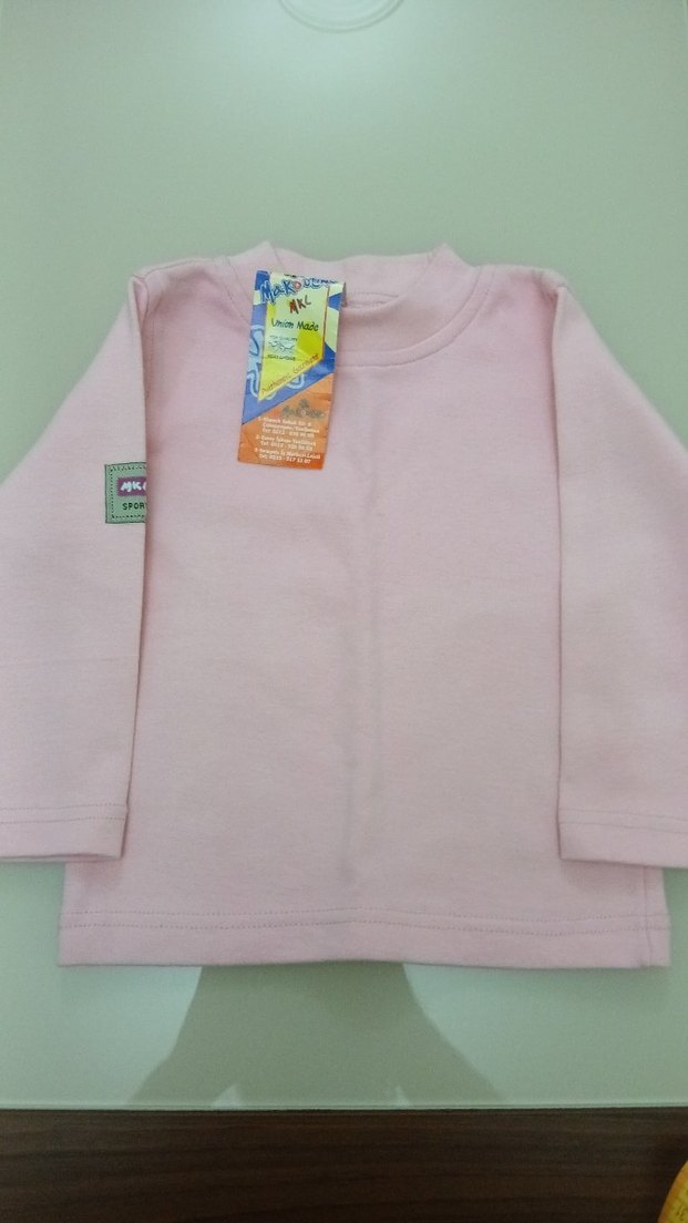 pastel pembe uzun kollu çocuk tişörtü. Hiç kullanılmadı, etiketi üstünde. Rengi biraz soluk çıkmış, rengi daha canlı. Boyu aşağı yukarı 37 cm, eni de toplam 60 a yakın cm.