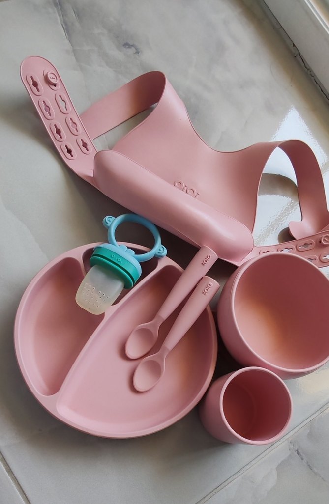 Bölmeli tabak, kase, bardak, kaşık, çatal ve ayarlanabilir kayışlı silikon önlükten oluşan pastel pembe çocuk yemek seti. Ayrıca halka saplı bebek besleyici içerir. ️