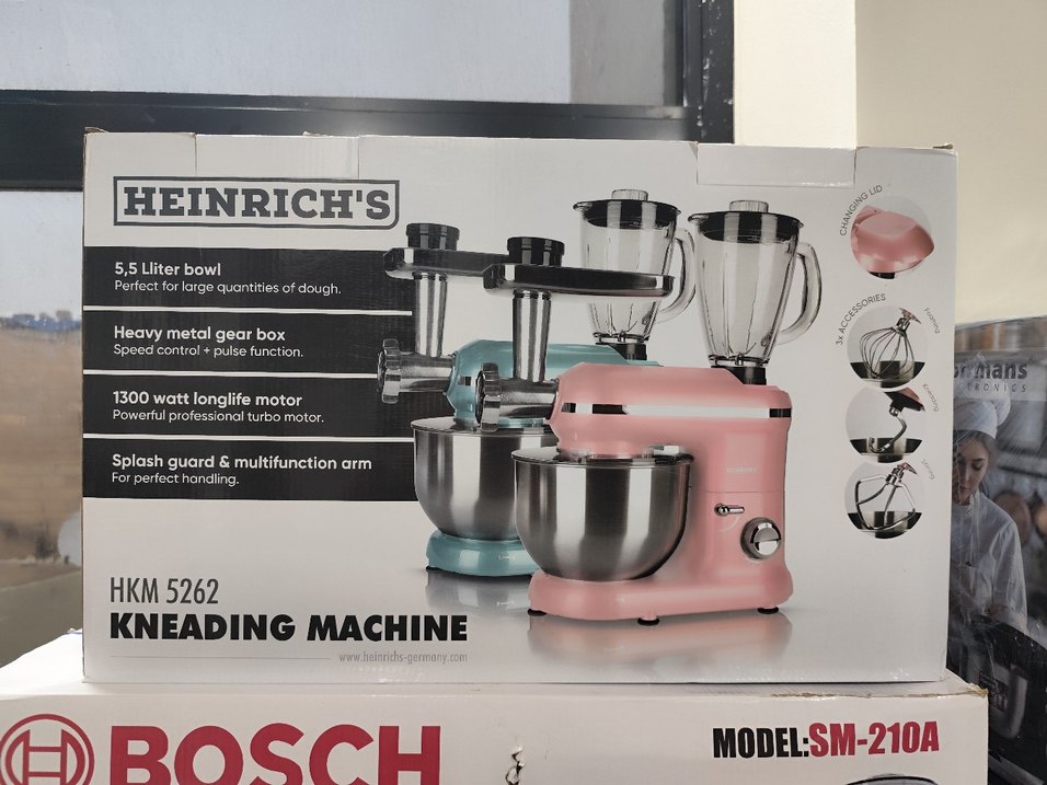 Pastel pembe çok fonksiyonlu mutfak makinesi, güçlü turbo motoru ve çok amaçlı kolu ile hamur karıştırmak için geniş kaseye sahiptir.