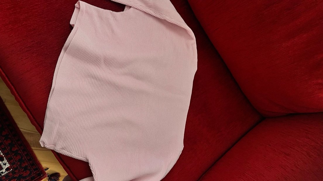 Yumuşak kumaştan yapılmış, pembe renkli örgülü kazak. XS-S İçin uygundur.