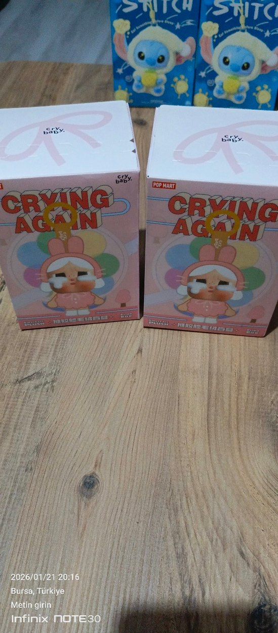 Pastel pembe renkte, Pop Mart'ın Crying Again serisinden ağlayan bebek karakter aksiyon figürü, orijinal kutusunda sunulmaktadır.