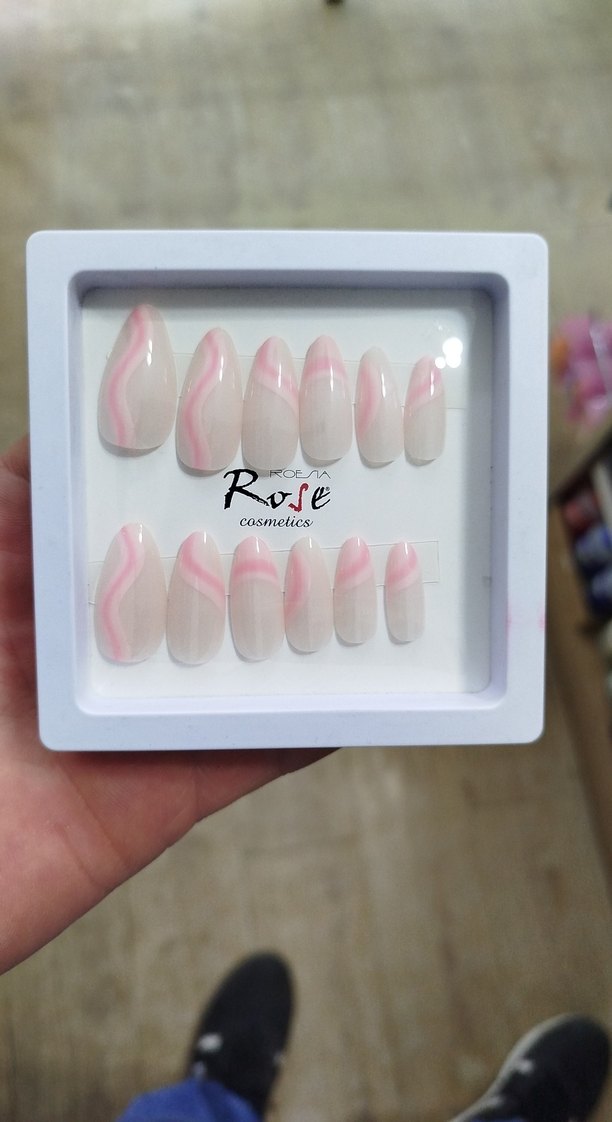 Pastel pembe dalgalı desenlere sahip tırnak süslemeleri, yumuşak ve zarif bir görünüm sunar. Farklı boyutlarda set halinde.