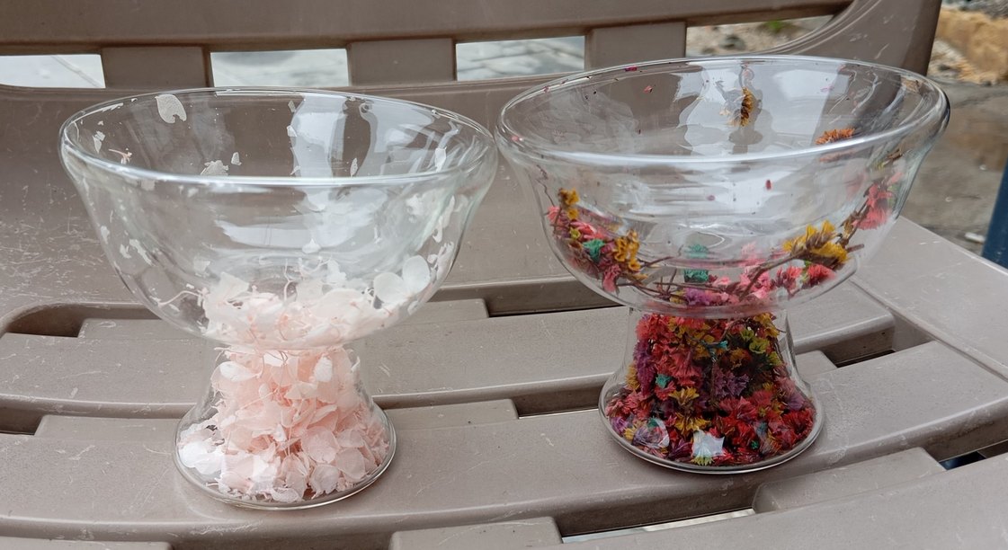 İki adet pastel pembe dekoratif cam kase, kurutulmuş çiçeklerle dolu, mekânınıza yumuşak bir dokunuş katmak için ideal .