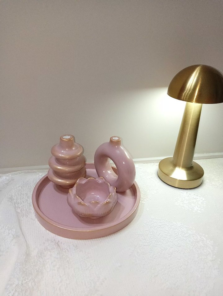 Pastel pembe renkte, farklı seramik dekoratif parçalar ve tepsi içeren set, mekana yumuşak bir dokunuş katar.