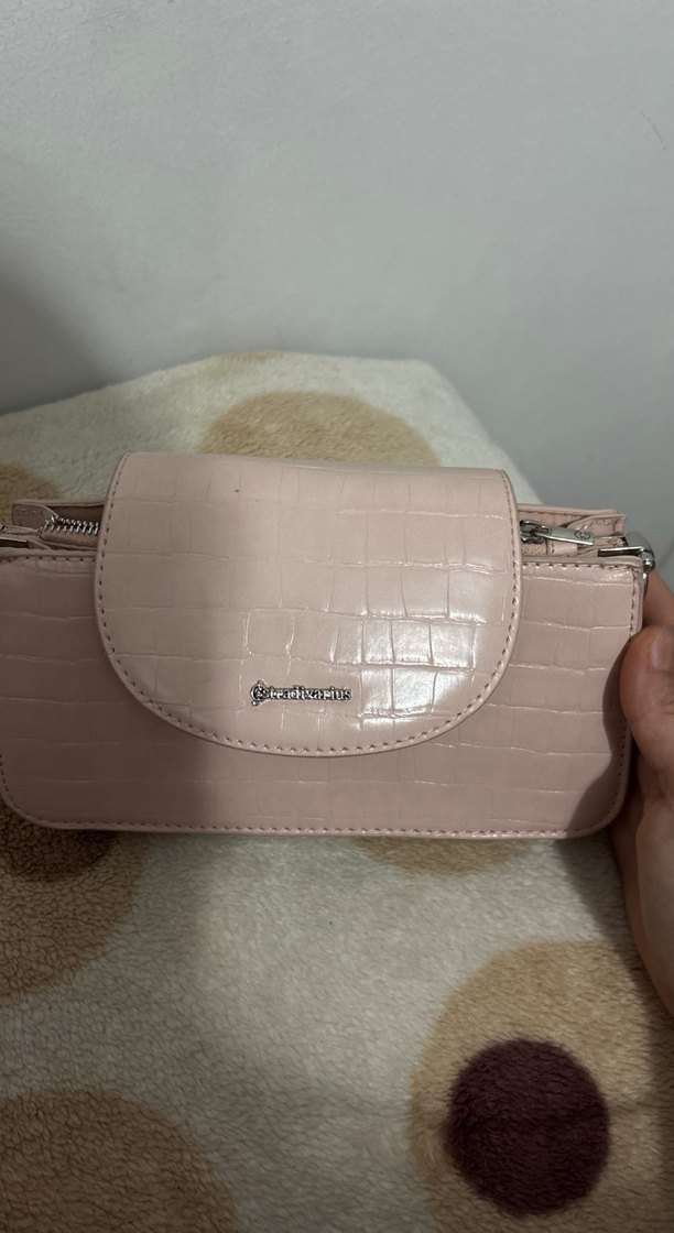Pastel pembe deri yılan desenli, fermuarlı çanta, trend sokak giyimine uygun.