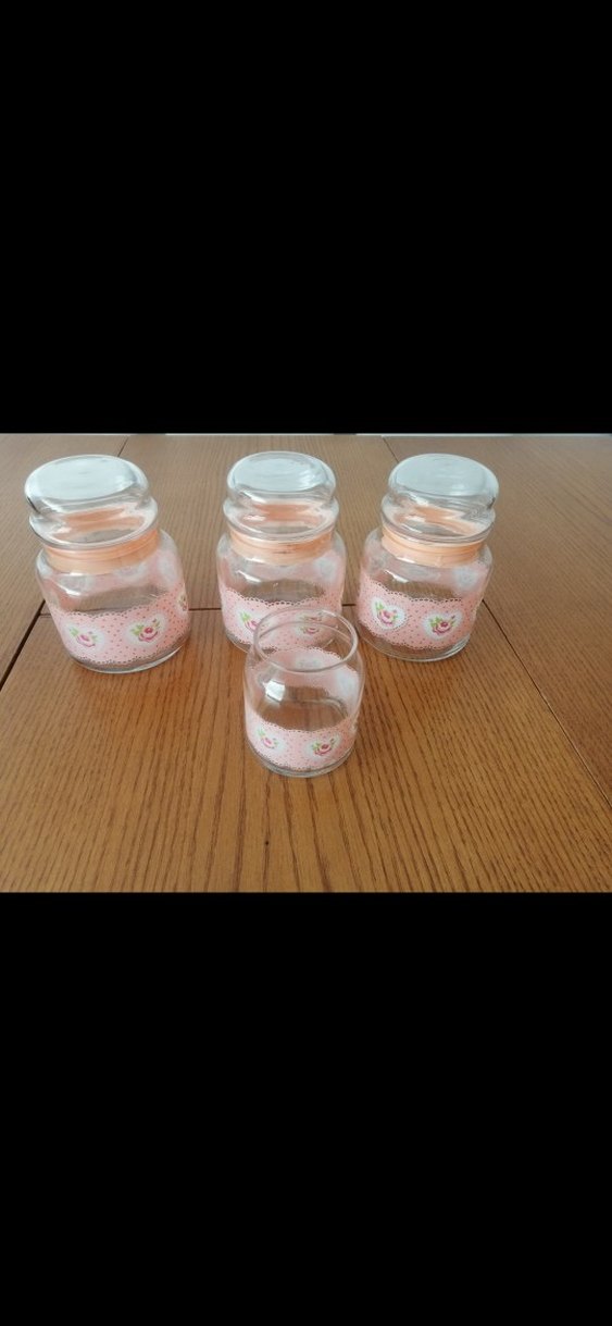 Pastel pembe çiçek desenli cam baharat seti, hava geçirmez kapaklı, mutfak veya dekoratif kullanım için uygun.