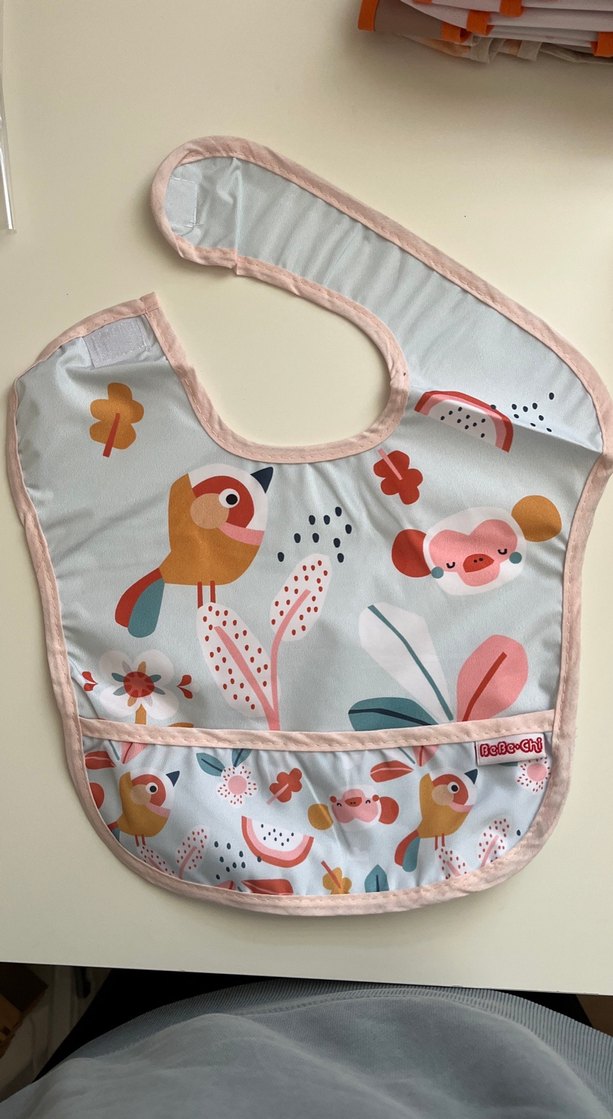 Pastel pembe kenarlıklı bebek önlüğü, kuş ve bitki desenleriyle renkli baskıya sahip. Döküntüleri yakalayan cep ve kolay kapanan cırt cırtlıdır.
