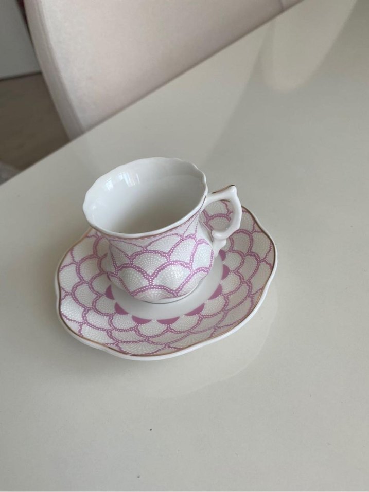 Pastel pembe desenli porselen fincan ve tabağı seti, kıvrımlı kulp ve dalgalı kenar detayına sahiptir. ☕ 6 lı set. Çok kibar ve güzel