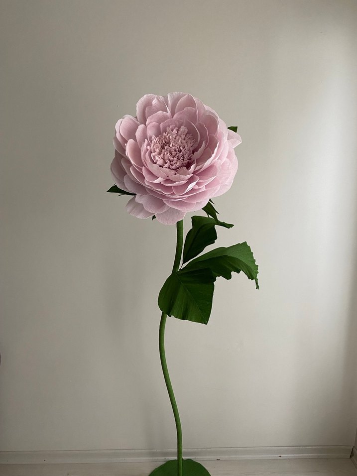 Yumuşak pastel pembe yapraklara ve yeşil yapraklara sahip büyük yapay çiçek.