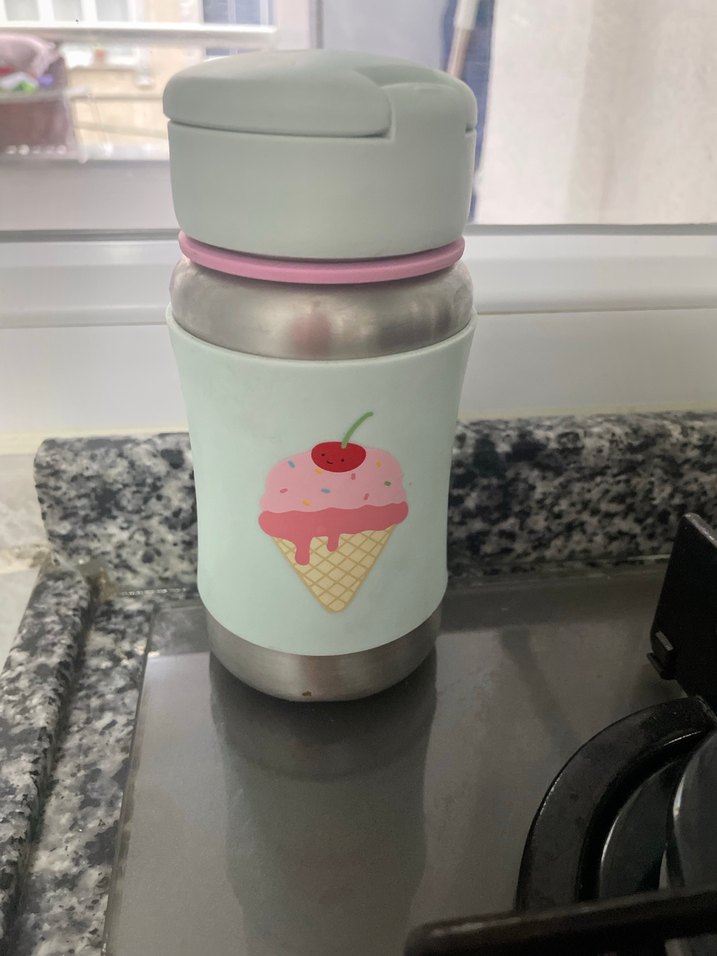 Pastel pembemsi renkte, dondurma desenli çocuk termosu. Güvenli kapaklı, içecekleri sıcak veya soğuk tutar.