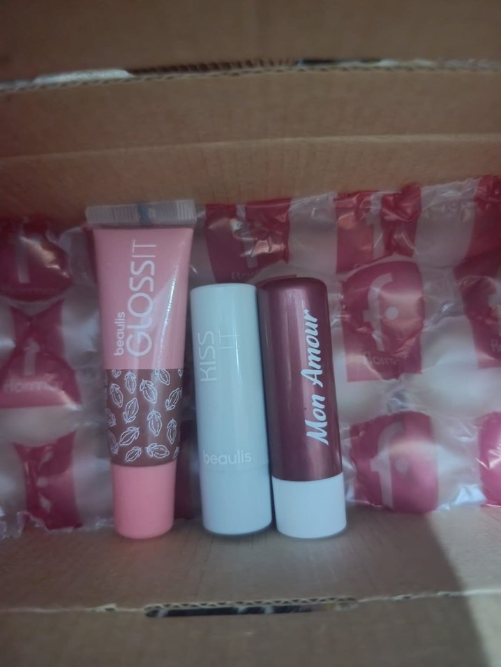 Pastel pembe dudak parlatıcısı, açık pembe ve koyu pembe rujdan oluşan yumuşak tonlar sunan set.