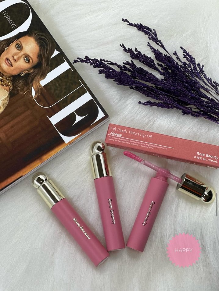 "HAPPY" yazılı pastel pembe dudak parlatıcısı, dudaklara yumuşak ve parlak bir renk verir.
