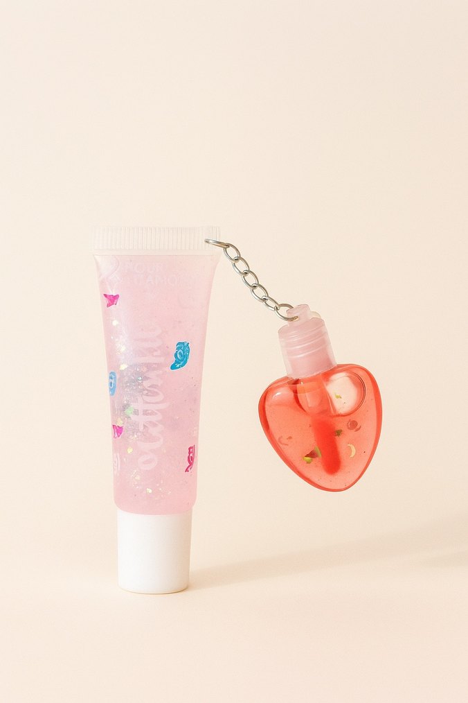 Pastel pembe renkte, hafif parlak ve yumuşak dokulu dudak parlatıcısı, yanında kalp şeklinde küçük bir anahtarlık ile birlikte. (Renk seçenekleri mevcuttur)