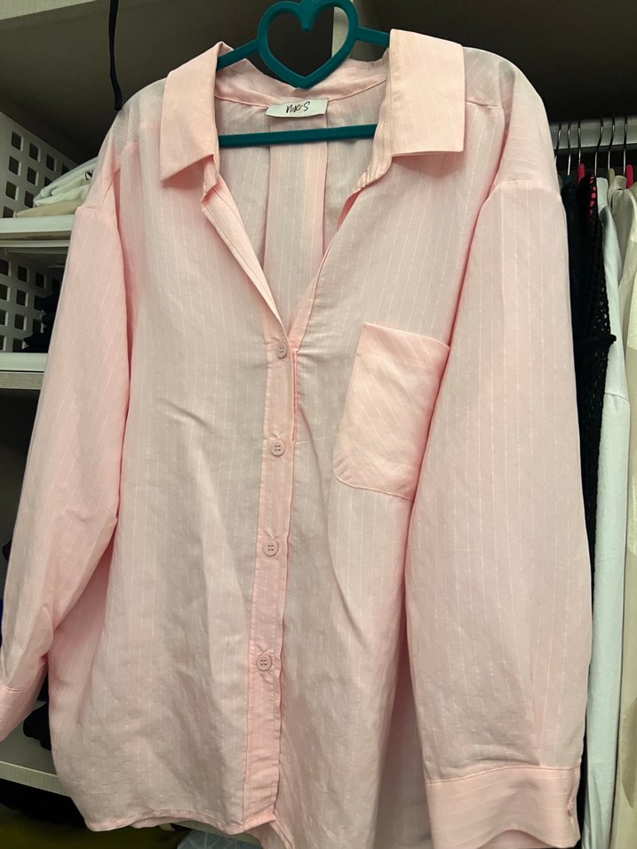 Pastel pembe renkte, keten kumaştan, düğmeli ve uzun kollu bol kesim gömlek. Notlu yakası rahat ve gündelik kullanıma uygun.