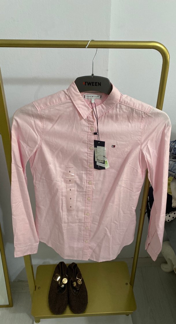 Pastel pembe düğmeli gömlek, uzun kollu ve kesimli yakaya sahip. Pamuklu, normal boyda ve rahat kesim. Günlük sokak stili için uygundur. Marka: tommy