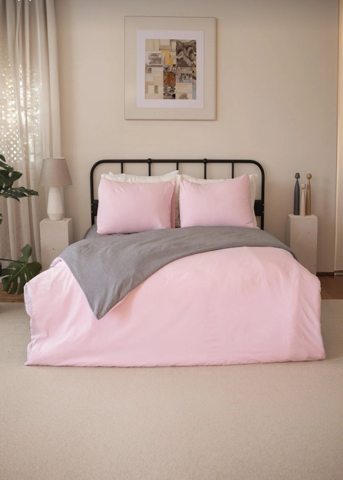 Pastel pembe renkte, desensiz ve yumuşak dokulu nevresim takımıdır. ️çift kişilik