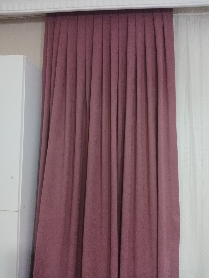 Konvansiyonel tarzda, pastel pembe renkte ve düz dokuda bir perde, mekâna yumuşak bir hava katıyor.