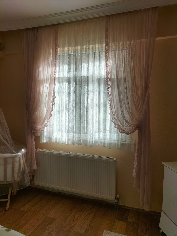 Pastel pembe renkte, düz ve hafif transparan yapıda klasik tül perde, mekâna yumuşak ve zarif bir hava katar. iki kanat az kullanıldı