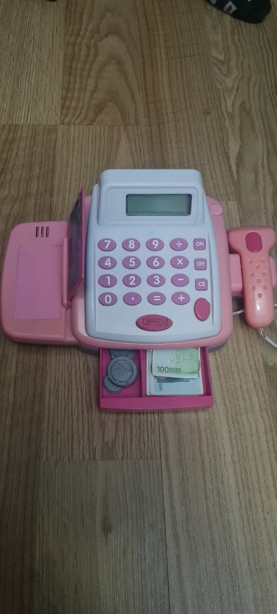 Pastel pembe renkte, hesap makinesi tuş takımı, küçük ekran ve çekmecesinde oyun parası ve madeni para bulunan eğitici oyuncak kasa. Oyuncak tarayıcı ile birlikte gelir.
