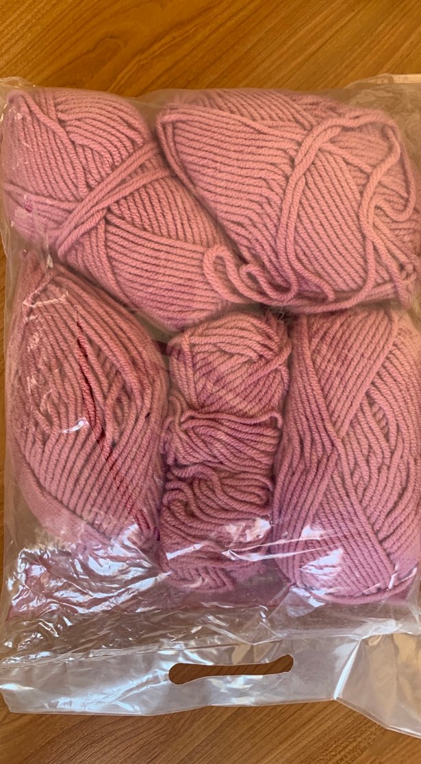 Pastel pembe renkte, el işi için yumuşak iplik paketi. Örgü ve tığ işi projeleri için uygundur.