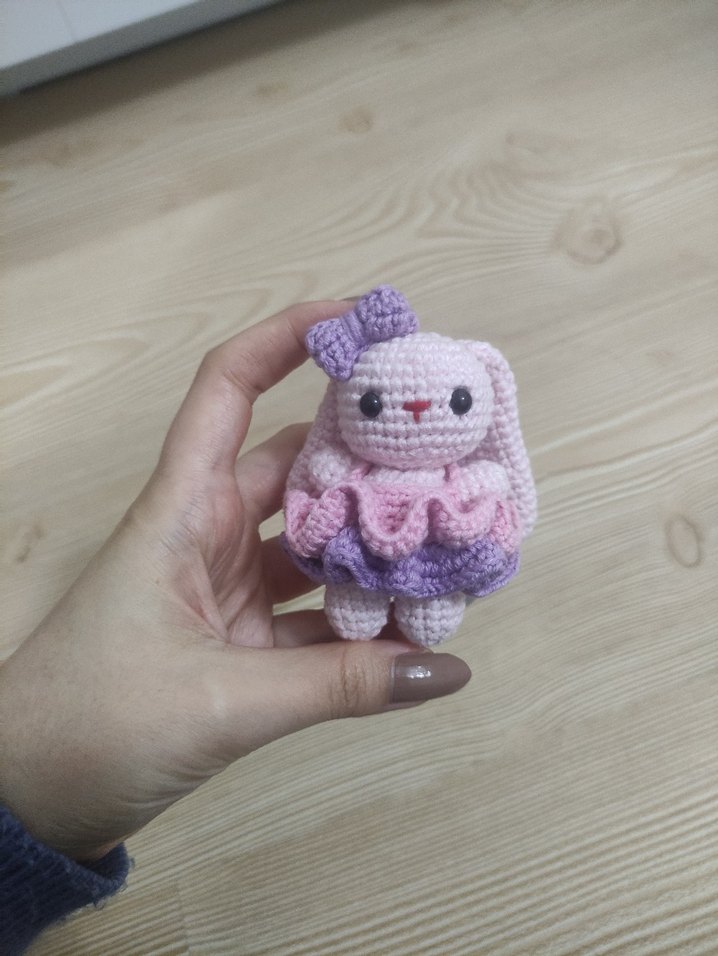 Yumuşak pembe ve mor tonlarda fiyonklu, fırfırlı etekli, el örgüsü sevimli peluş oyuncak.
