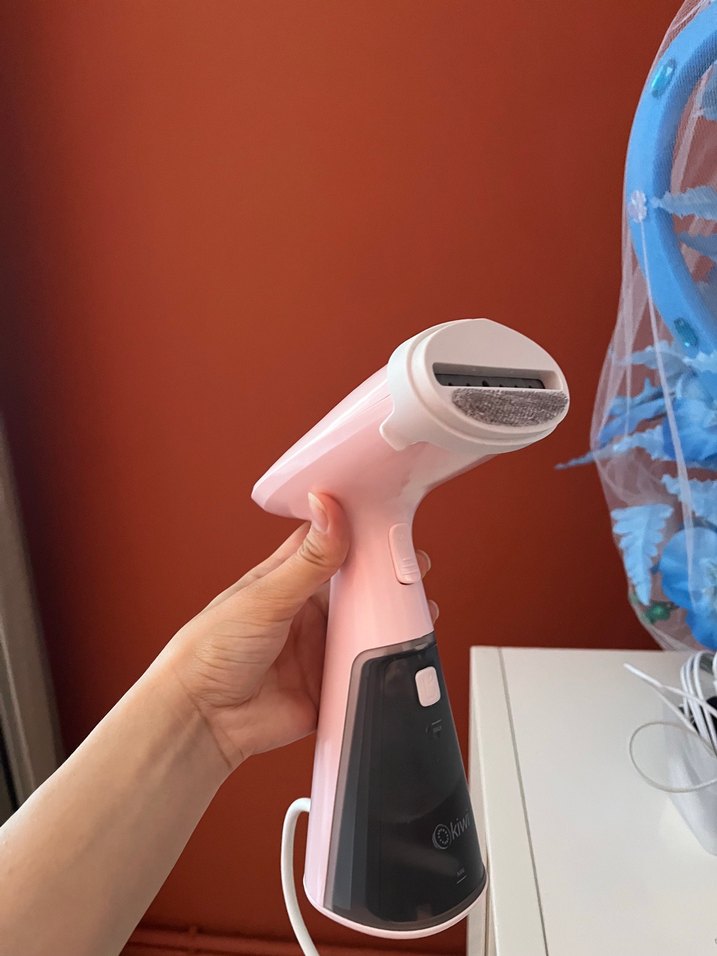 Pastel pembe renkli el tipi buharlı ütü, kompakt tasarımıyla kırışıklıkları hızlıca açar. Su haznesi ve buhar başlığı ile etkili kumaş bakımı sağlar.