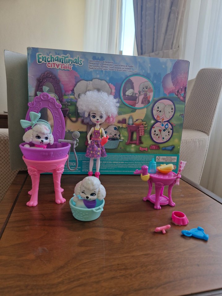 Pastel pembe Enchanimals oyun seti, kıvırcık beyaz saçlı bebek, evcil hayvan figürleri ve makyaj masası, küvet gibi aksesuarlar içerir.