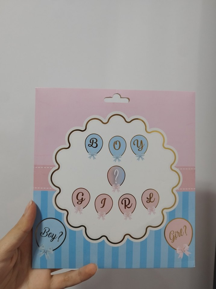 Pastel pembe ve mavi renklerde, üzerinde 'Boy?' ve 'Girl?' balonları bulunan cinsiyet açıklama partisi süsü.