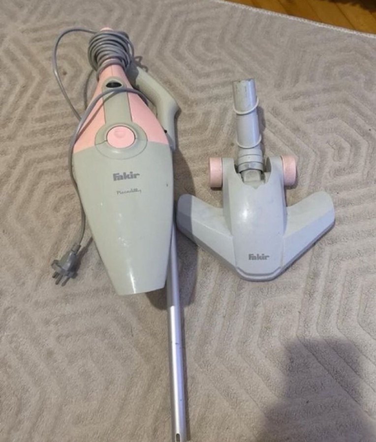 Pastel pembe renkte Fakir marka elektrikli süpürge, elde tutulan tasarım ve ekstra zemin aparatı ile çok yönlü temizlik sağlar. Uzun sap ve kablo mevcuttur.