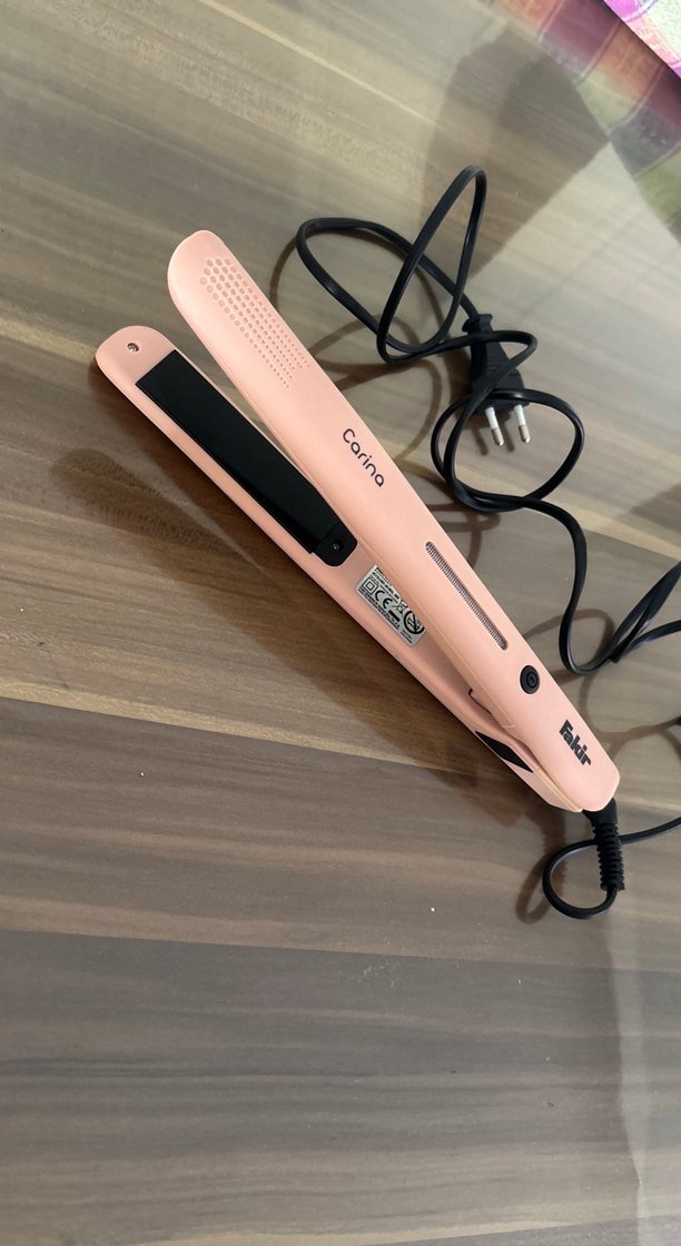 Pastel pembe FAKİR saç düzleştirici, pürüzsüz plakalar ve kullanımı kolay kompakt tasarım sunar. Güç düğmesi ve fişli kablo içerir.
