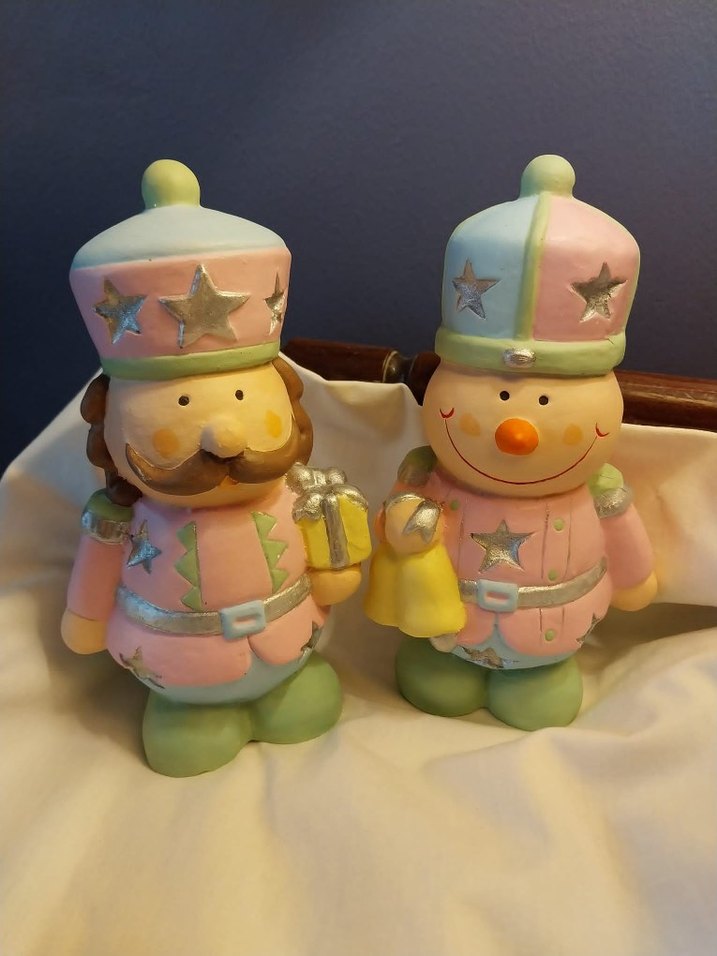 Yıldız detaylı, hediye tutan asker ve kardan adam figürinleri pastel pembe tonlarında, sevimli ve yumuşak görünümlü.