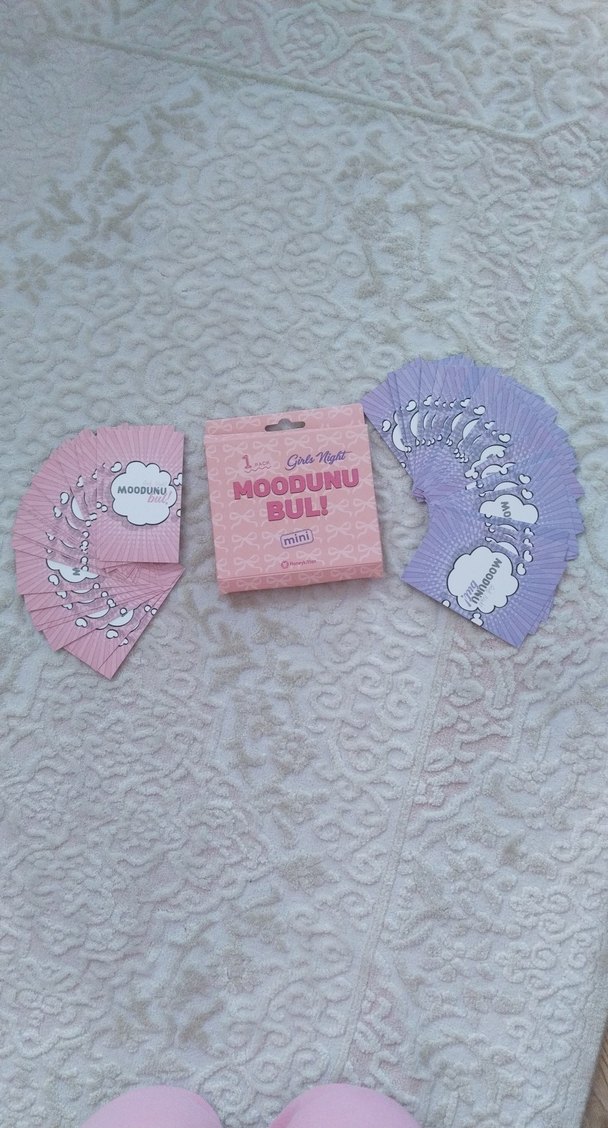 Pastel pembe renkte, "MOODUNU, BUL!" eğlenceli oyunlar.