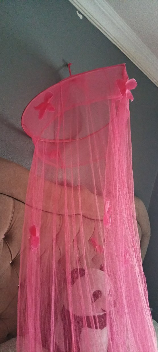 Pastel pembe renkte, gotik tarzda, tül ve desen içermeyen bu perde, dekoratif fiyonklarla süslenmiştir. Odaya yumuşak ve masalsı bir hava katar. ister tek kişilik ister çift kişilik yatak için uygundur