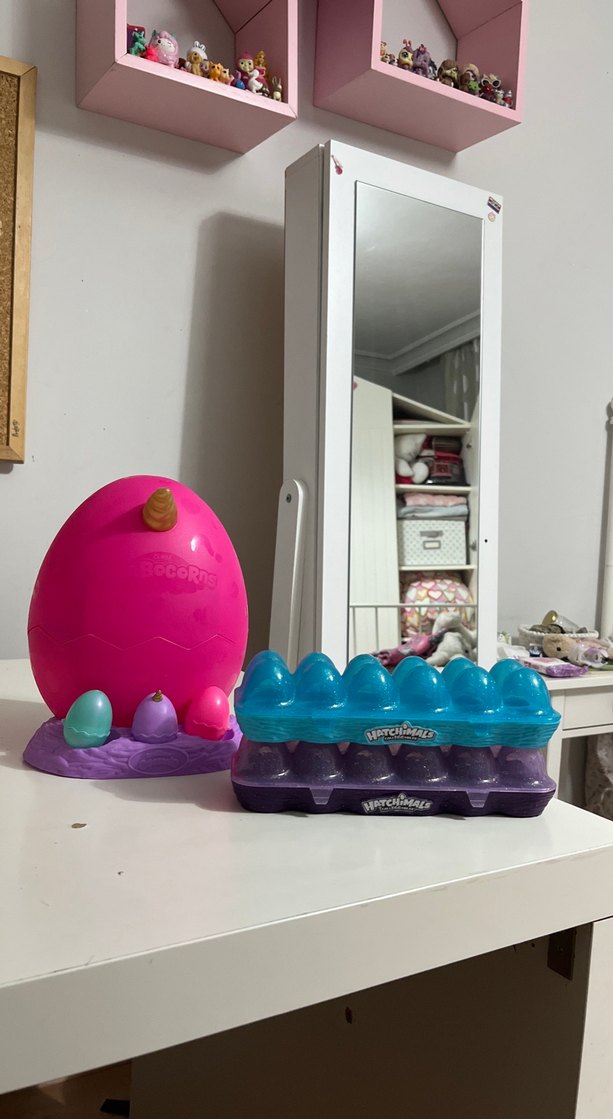 Pastel pembe Hatchimals oyuncak, büyük bir yumurta ve içinde küçük yumurtalar bulunan bir kutu içerir. İçi boş teklif verebilirsiniz