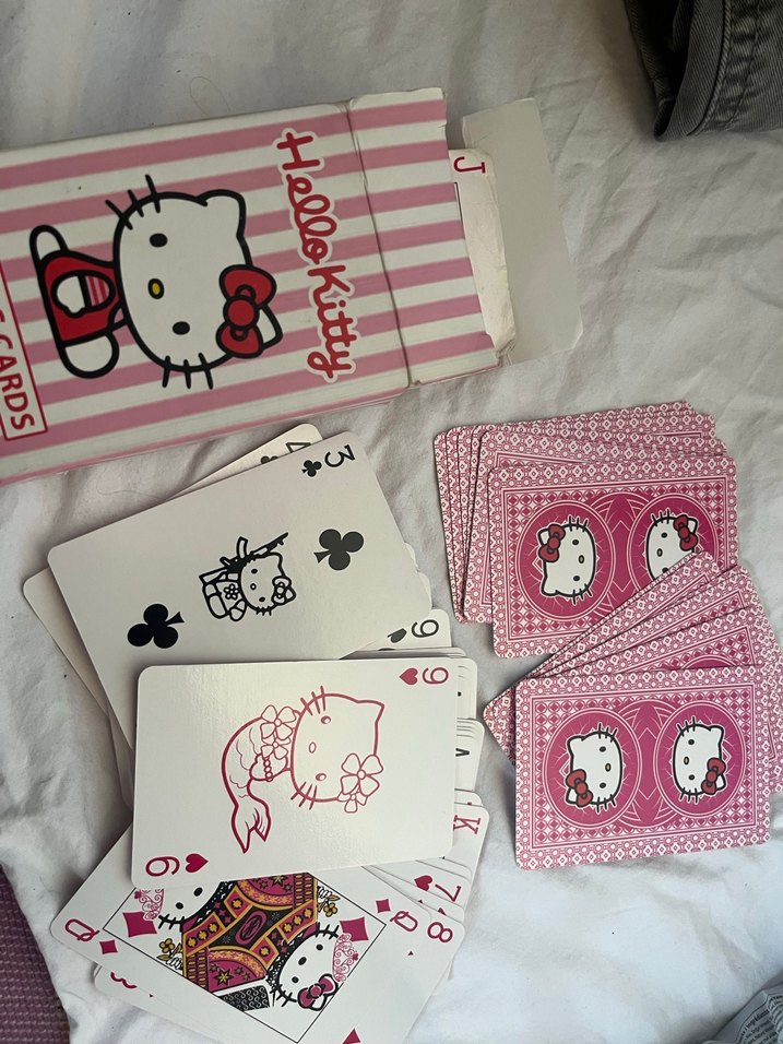 Pastel pembe Hello Kitty oyun kartları, her kartta sevimli karakter çizimleri ve çizgili kutu ile birlikte gelir. ♠️