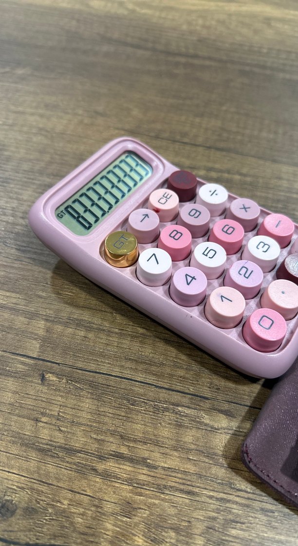 Pastel pembe renkte, yuvarlak ve renkli tuşlara sahip hesap makinesi, şık ve kullanışlıdır.