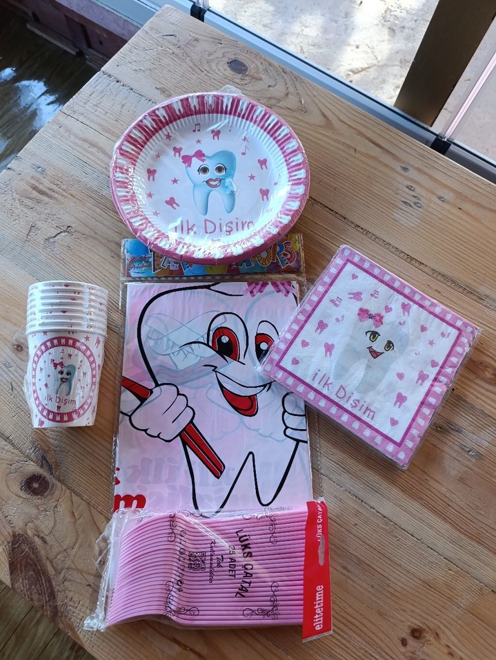 Pastel pembe renkli İlk Dişim temalı tabak, bardak, peçete ve süsler içeren parti seti.