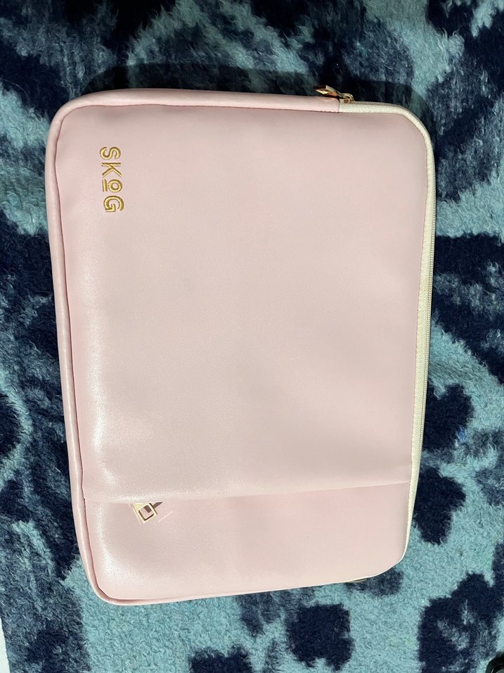 Pastel pembe renkte, fermuarlı ve baskılı minimalist tasarımlı kadın laptop çantası. Sentetik kumaştan yapılmıştır, günlük kullanıma uygundur. Üzerinde "SKOG" markası bulunur.