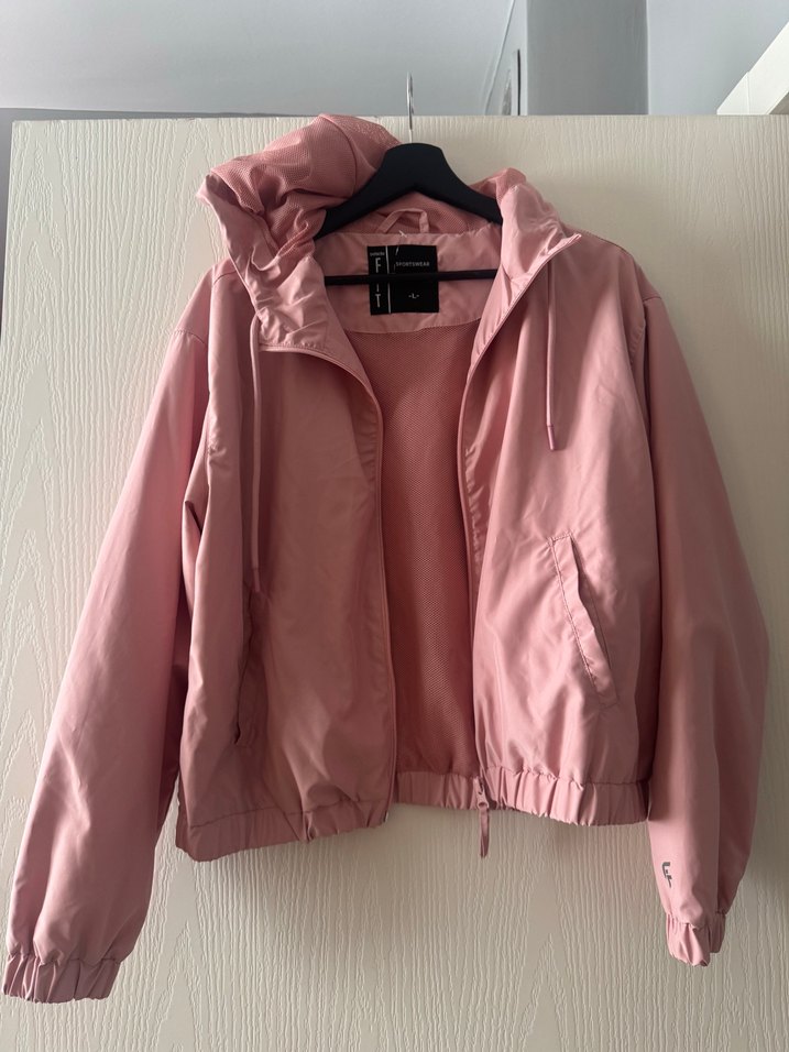 Pastel pembe renkli, fermuarlı, uzun kollu, notched lapel yakalı, bol kesim kadın spor ceketi, yumuşak sentetik kumaştan üretilmiştir.