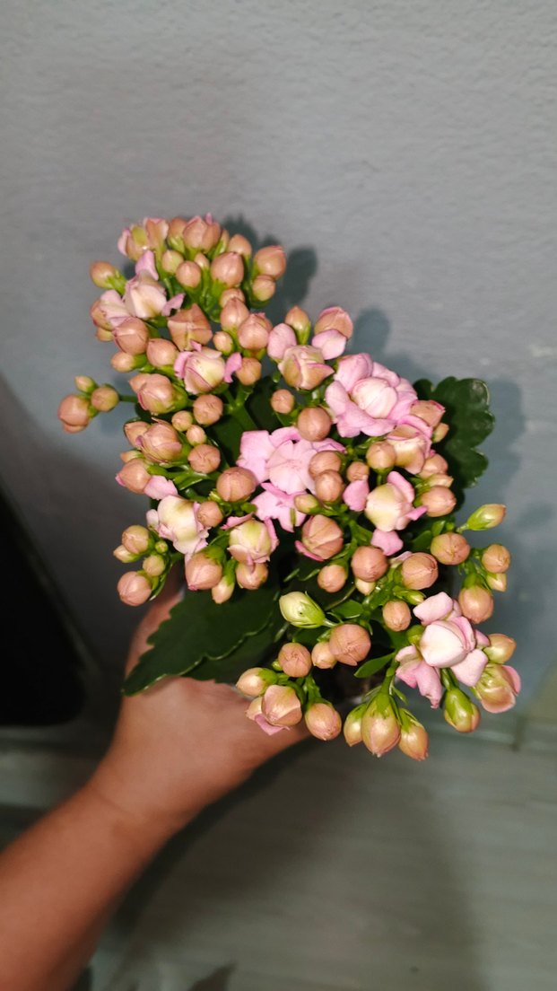Pastel pembe kalanchoe çiçekleri ve yeşil yapraklarla ev dekorasyonu için uygun bir buket. iri çiçekli katmerli kalanso